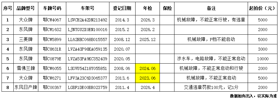 四、特別提醒:拍賣車輛不含車牌號(hào)碼,以現(xiàn)狀拍賣現(xiàn)狀交付。